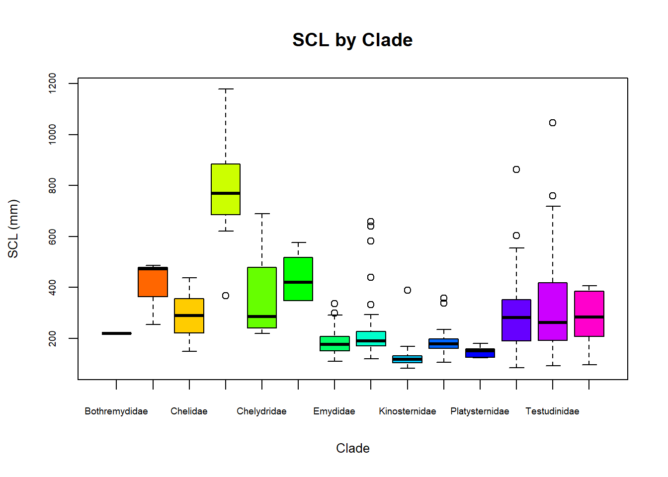 Note that, in this case, we used the formula SCL ~ Clade to specify that the SCL values should be grouped by Clade and defined the dataframe using the data argument. We also created a vector of colors using the rainbow() function to assign different colors to each clade. As for the n argument (number of colors), we used the length() of unique() clades in the dataframe.