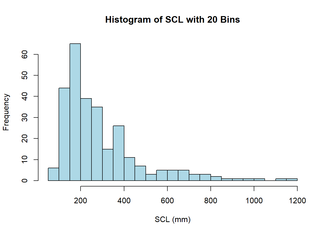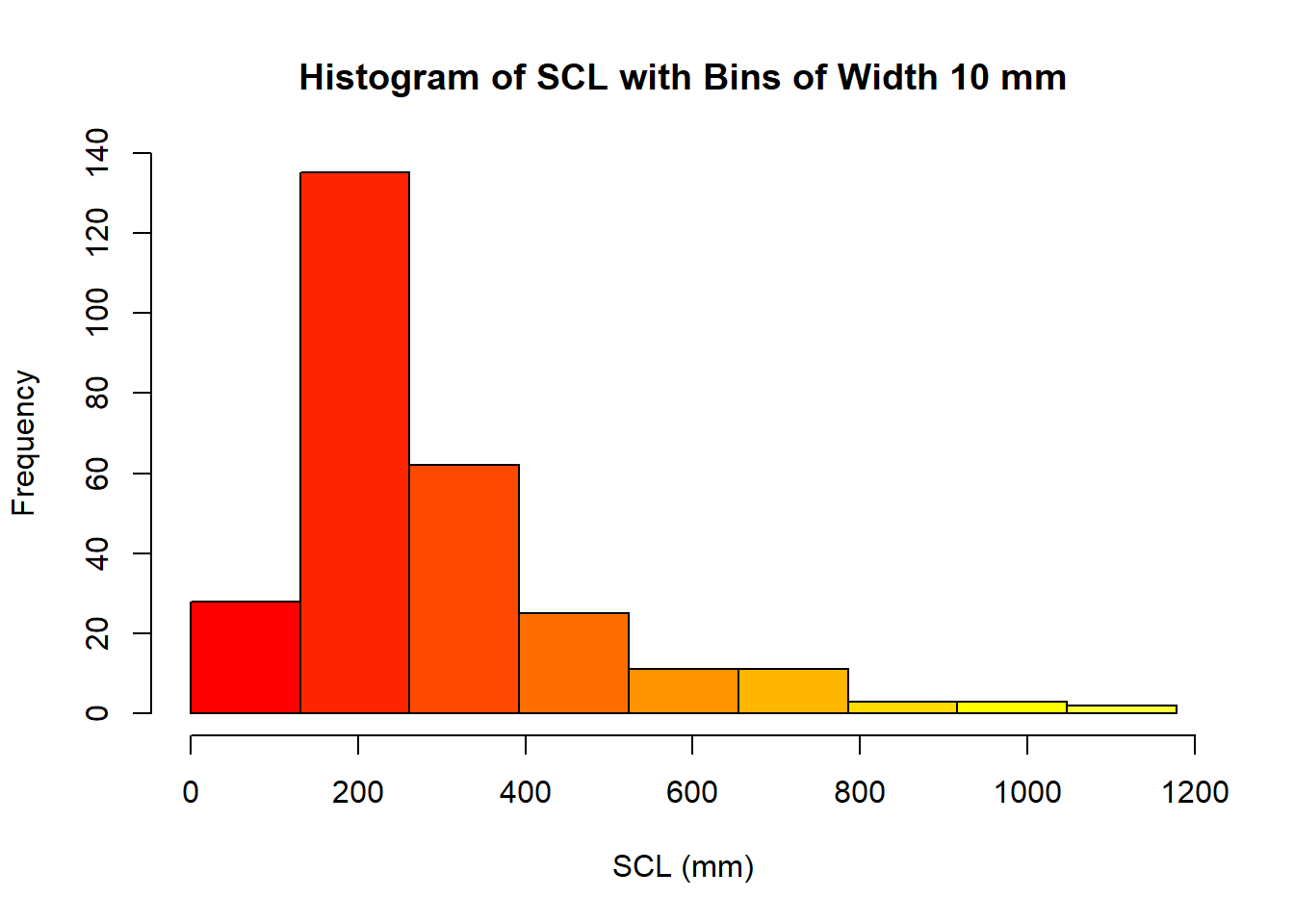 main = "Histogram of SCL with Bins of Width 10 mm",