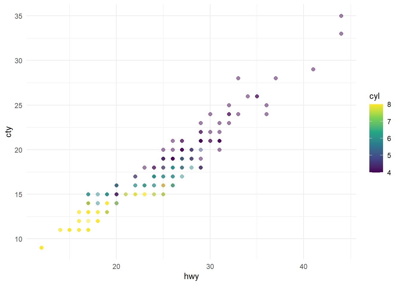 ggplot(mpg, aes(x = hwy, y = cty, color = cyl)) +