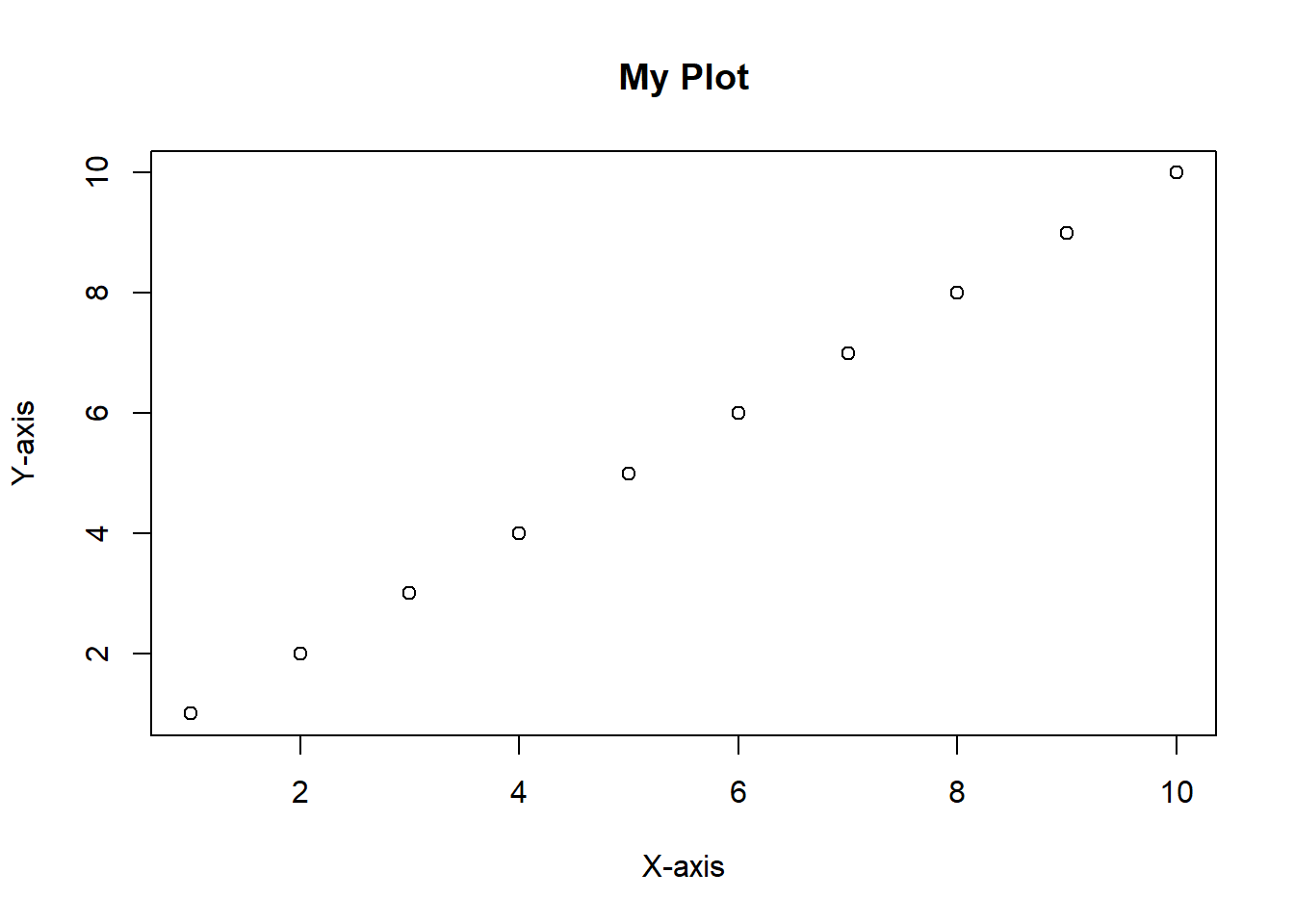 plot(1:10, 1:10, main = "My Plot", xlab